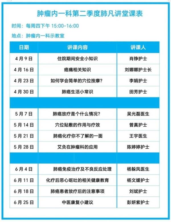 初心不改,科普续航。第二季度,该院肿瘤内一科将在一季度课程基础上,围绕住院安全、中医护理、放化疗康复、前沿治疗等核心需求优化课程,精心规划4至6月授课内容,提升科普针对性与实用性。医院热忱欢迎肿瘤患者及家属莅临聆听,恳请社会各界提宝贵意见,助力“肺凡讲堂”提质增效,让健康知识走进患者身边、融入日常护理。