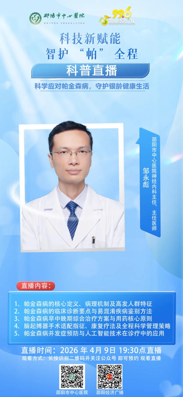 为普及帕金森病防治知识,帮助群众科学认识、规范应对该病,邵阳市中心医院特举办专题直播。直播定于4月9日(星期四)晚19:30,在《爱健康医说直播间》准时开播,特邀该院神经内科主任邹永彪主任医师主讲。